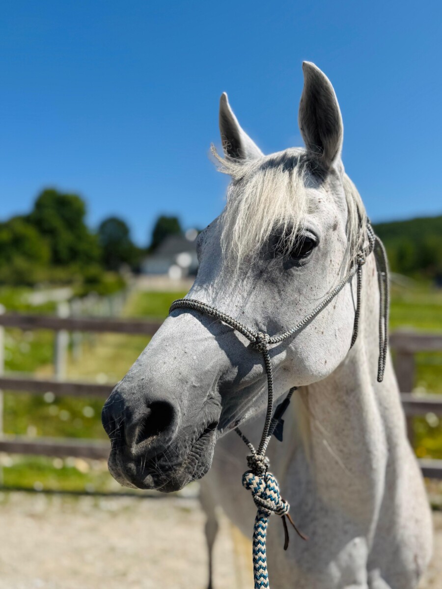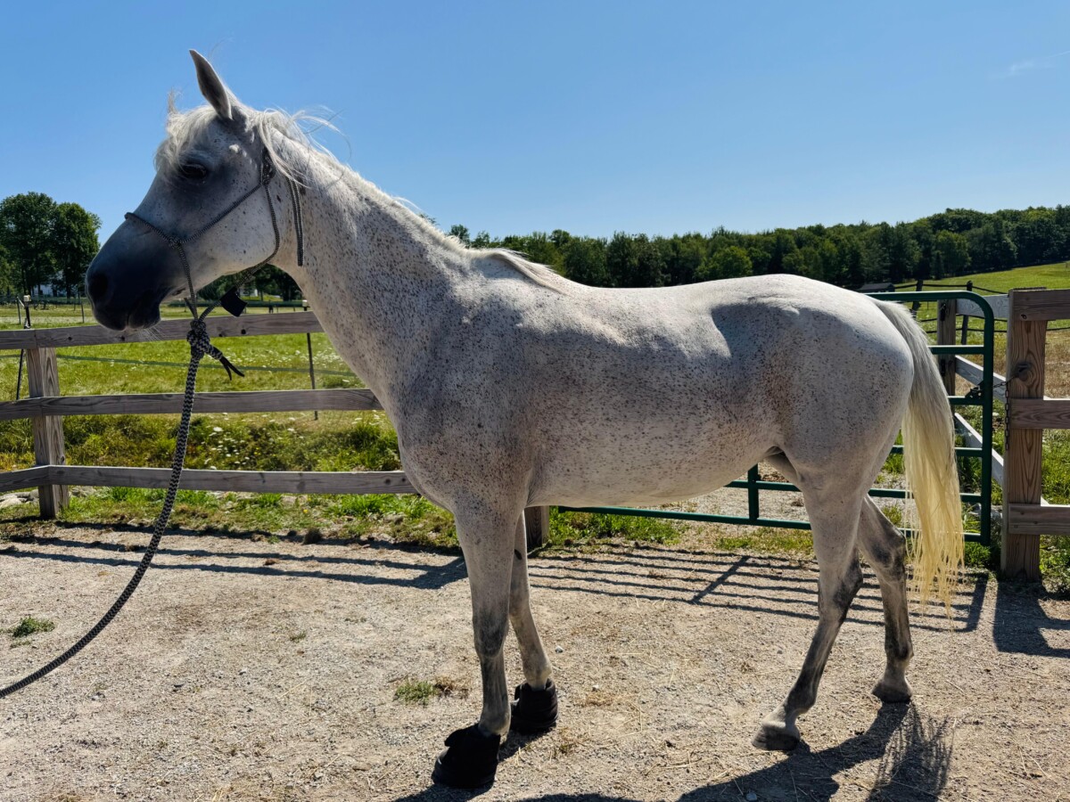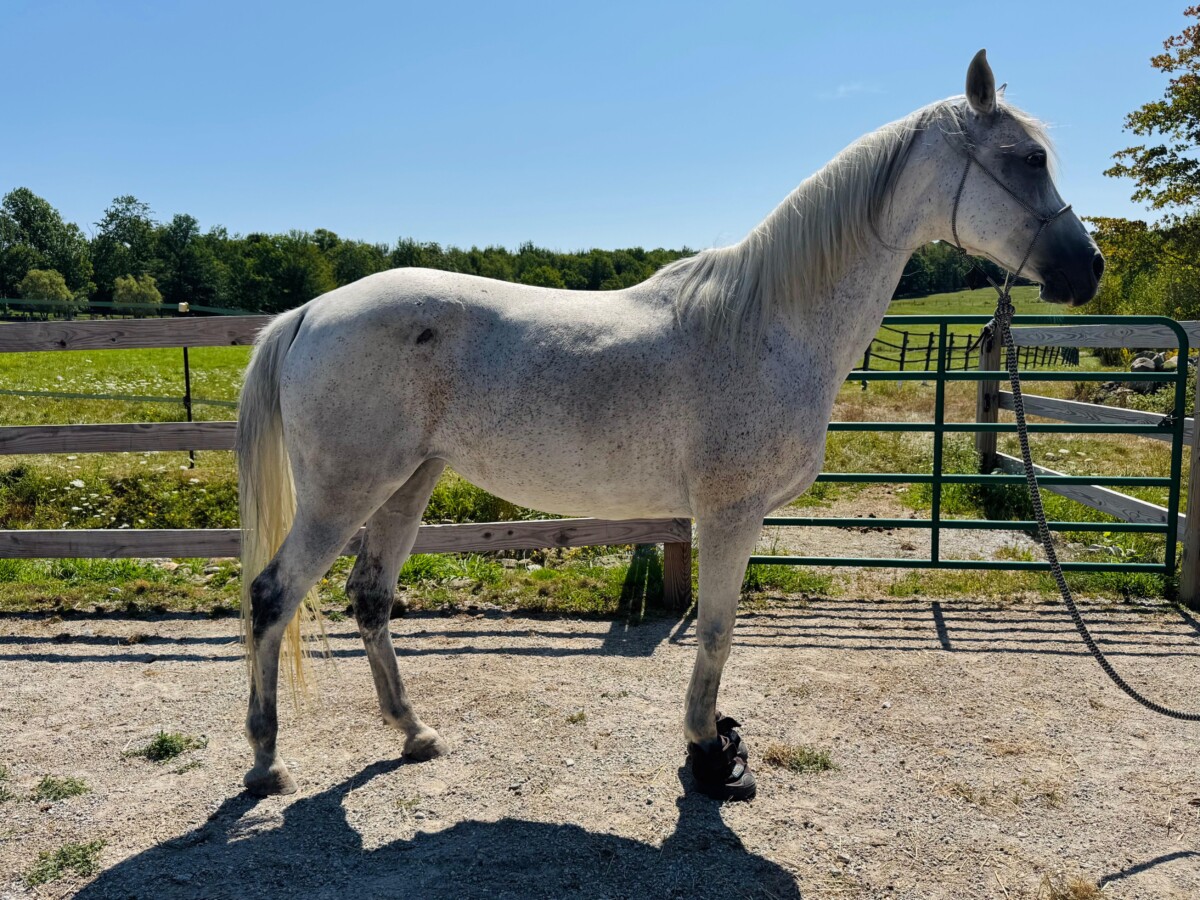 Galaxy is a 15 year old Arab-X mare, who has joined us for training from Gerda’s Equine Rescue in August 2025. Galaxy was seized by the state of New York from a hoarding situation, where she was very much in need of proper nutrition and regular hoof care. She has very thin soles and is sore when barefoot, but is quite the pretty mover as soon as she has her Cloud boots on! We are looking forward to getting her feeling more comfortable, evaluating what she knows, and giving her what she needs to thrive.