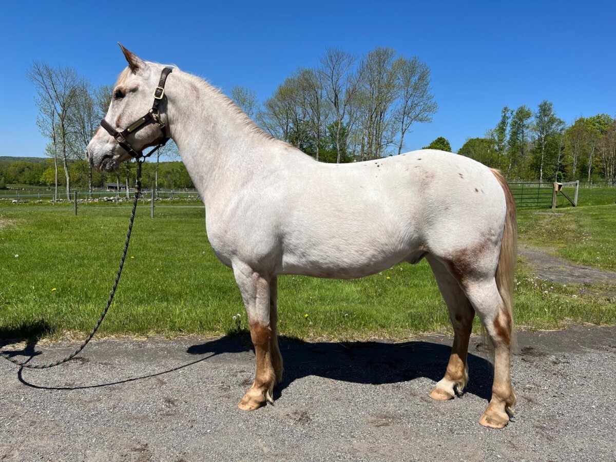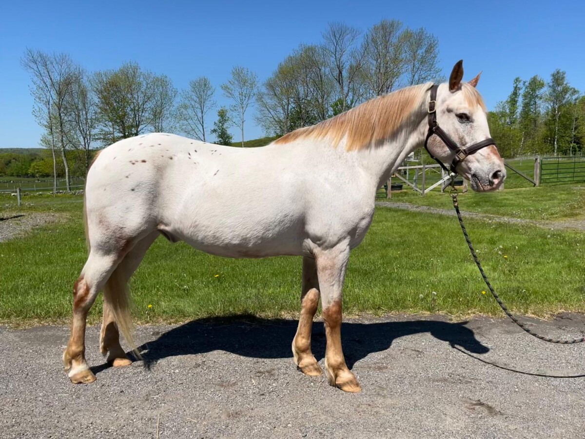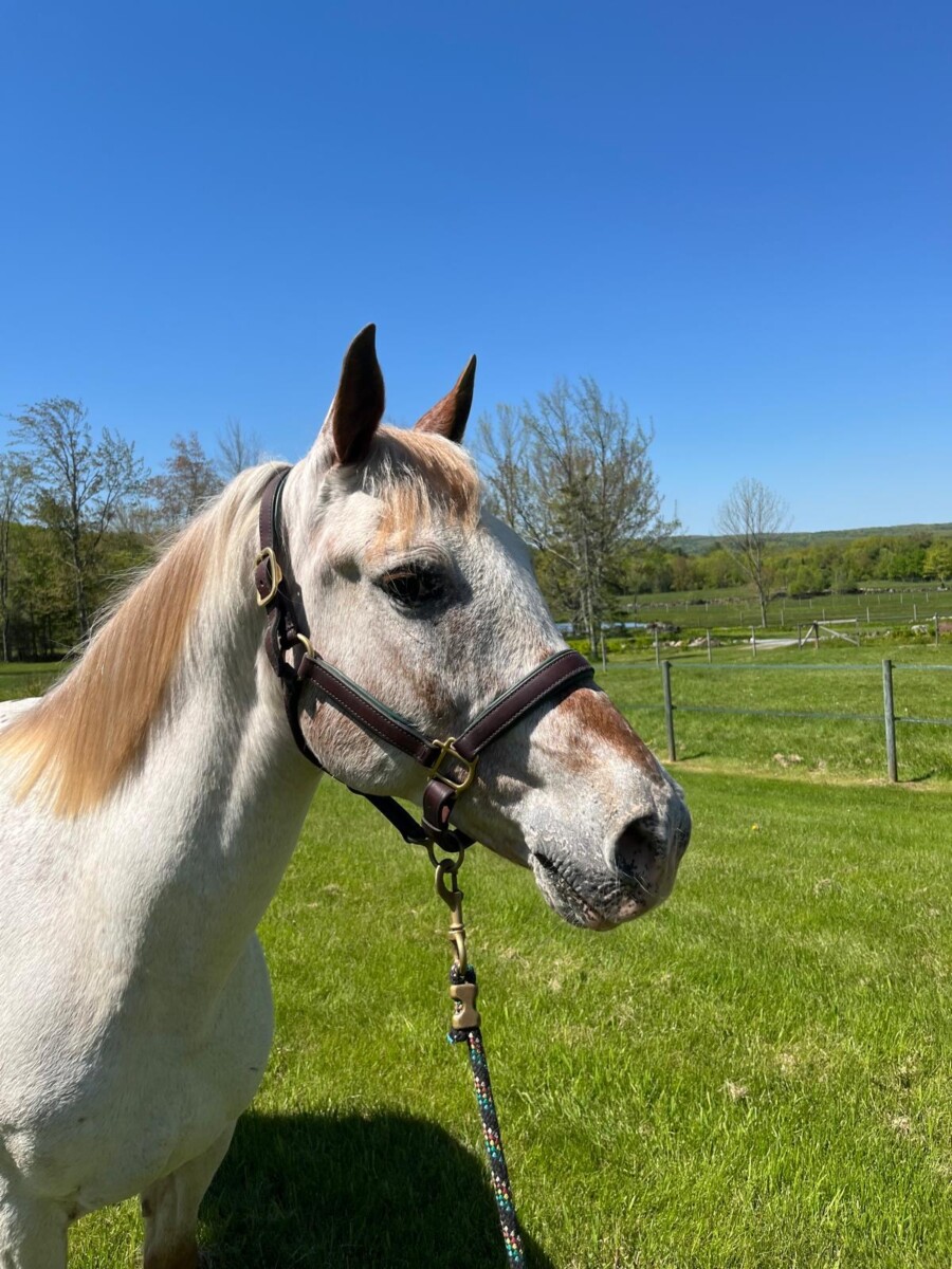 Rio is a 21-year-old Appaloosa gelding, joining us for training in February 2025 from the Maine State Society for the Protection of Animals. Upon his arrival to the MSSPA in February 2024, Rio had an eye infection that did not resolve with treatment, and thus had to have his left eye enucleated. He has adapted very well to the loss of his eye, and isn’t particularly bothered by his limited vision. Even though Rio is already broke to ride (and is said to be quite peppy under saddle!), we will be taking it back to basics and filling in any gaps in his training before evaluating him as a riding horse.
