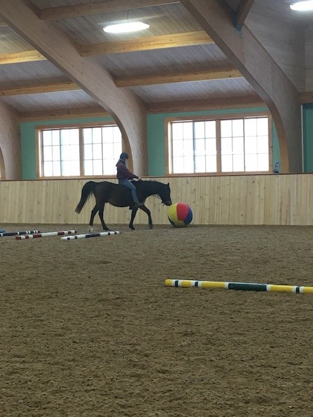 This was a challenging concept for us to grasp, so Libby coached us through various examples. For instance, if you trot off in the arena on a loose rein and don’t direct your horse, many will turn around and make a beeline for the gate. When this happened, Libby had us increase pressure (by bumping with our stirrups) at the gate, and stop bumping as soon as the horse thought about leaving the gate. Most horses would veer off, but then circle back and try again. However, it didn’t take too long before they decided that things got harder by the gate, and they would then find another spot in the arena where we immediately let them stop and take a break– no pressure. Rather than dictating, we were simply letting the horse figure out for themselves that there was no relief by the gate– that in fact it was more work over there. After letting the horse make that decision, we found they were much more engaged and responsive when we did pick up the reins again.